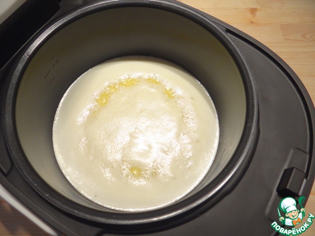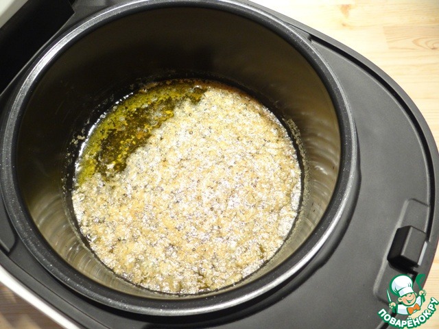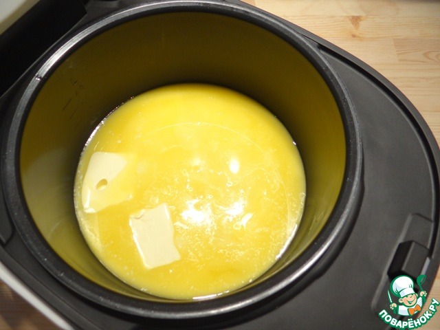 Включаю мультиварку на режим "Мультиповар", устанавливаю температуру 100 градусов, время - 60-80 минут. Масло помешиваю ложкой, чтобы оно топилось равномерно.