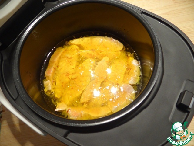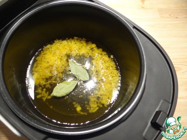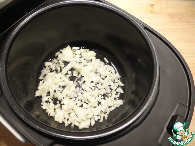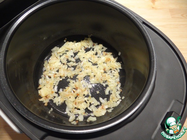 На программе "Мультиповар" при 100 градусах обжариваю репчатый лук до мягкости.