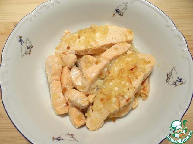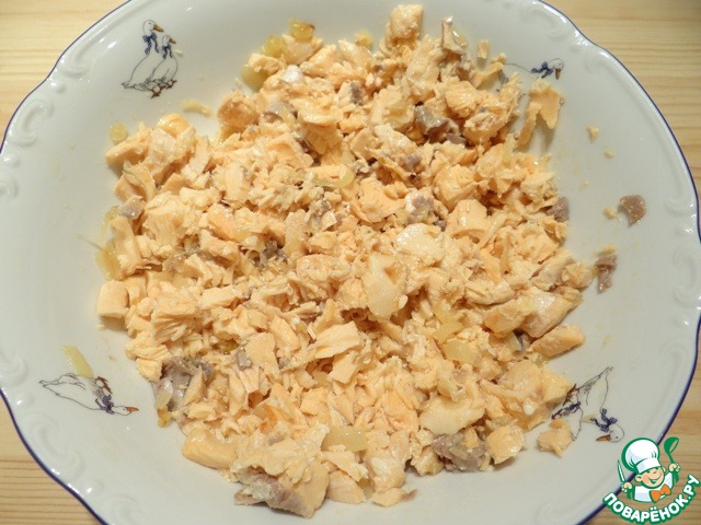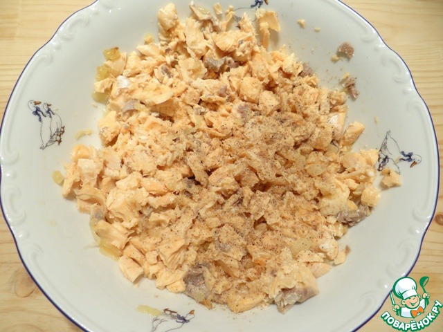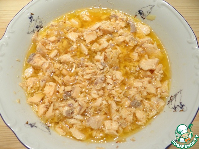 Разминаю его с помощью вилки на маленькие кусочки (но не стоит делать пюре).