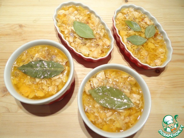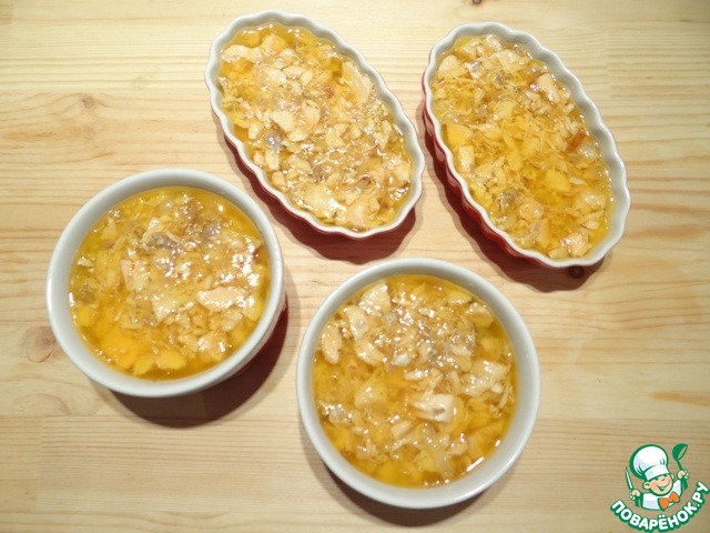 Затем заливаю конфи оставшимся топленым маслом. Слой топленого масла создаст защитную пленку, и такое конфи можно хранить в холодильнике до одной недели. Снова помещаю формочки в холодильник.