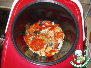 • Добавить к нему болгарский перец, чеснок, имбирь, специи, перец чили - продолжить обжаривание.