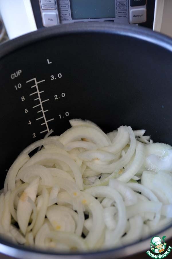Всё дно выкладываем нарезанным луком.