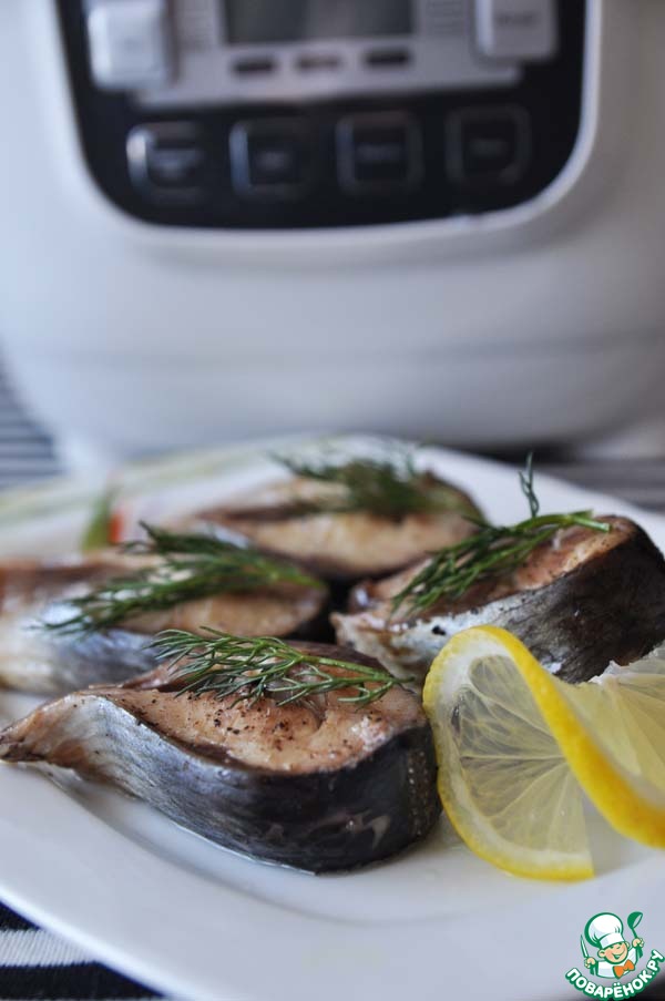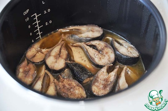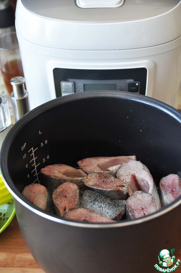 Выкладываем сельдь в чашу мультиварки. Посыпаем свежемолотым чёрным перцем, солью, поливаем соком лимона.