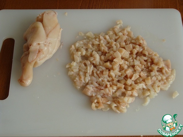 Нарезаем мелко-мелко 1 тушку кальмара.