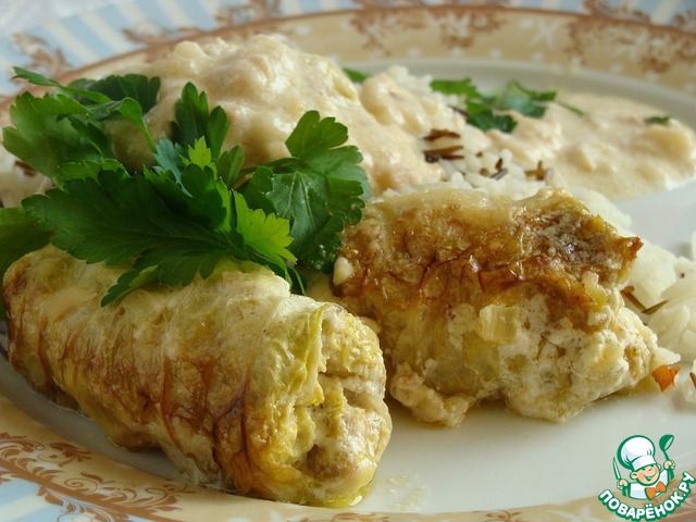 ... с соусом из кальмаров. Я опять к вам с голубцами. Только с рыбными. Нежная сочная начинка дополняется соусом, который вы просто вымакаете хлебом - настолько он вкусный. Заходите, угощаю!