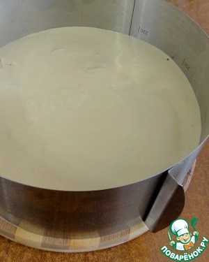Укладываем первый корж на дно разьемной формы, сверху выкладываем 1/2 часть мусса.