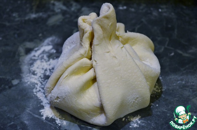 Собираем тесто в мешочек. Для надёжности можно перевязать сверху ниткой, но не туго.