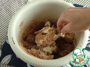 Смешиваем с мукой, просеянной с 20 г какао, и в конце добавляем взбитые белки - перемешиваем.