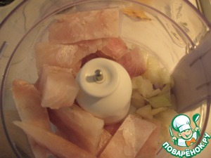 Рыбу порезать кусочками. Советую филе рыбы брать подмороженное, так рыба не будет накручиваться на нож и проще сделать фрикадельки. Луковицу порезать. В комбайне перемолоть рыбу с луком.