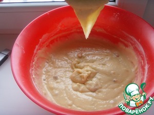 Для начала включим духовку на 180 град., потому что замес происходит очень быстро. Растопим маргарин. Я растапливаю в микроволновке 1-1.5 мин. Туда закидываем все ингредиенты, но сахар и яйца кладем в последнюю очередь, иначе яйца могут свариться, а сахар слишком быстро раствориться и не дать нужной корочки.