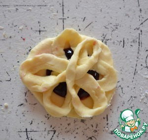 А из колечка формируем цветочек. Сначала делаем восьмёрки (нижнее колечко больше, чем верхнее), а потом с нижнего колечка - еще одну восьмёрку. Получается три "лепесточка". Цветочки немножко придавить к кружочку с джемом.