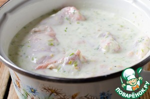 Опускаем курицу в кефирный маринад, накрываем крышкой или пищевой пленкой и отправляем в холодильник минимум на 6 часов, а лучше на ночь. -