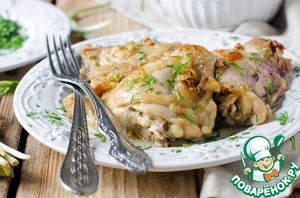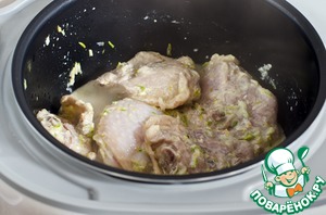 Курицу режем довольно крупными кусками, я брала бедрышки, но можно любую ее часть.