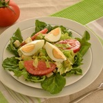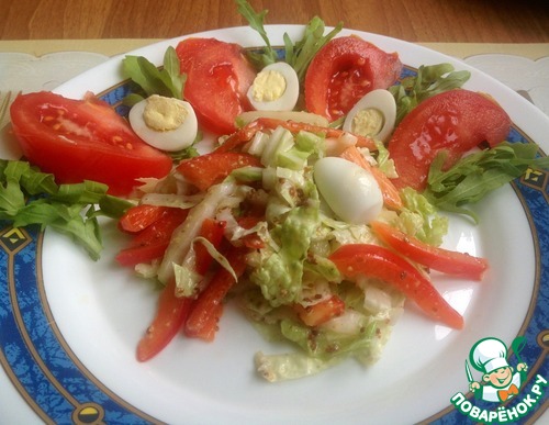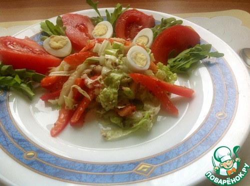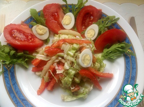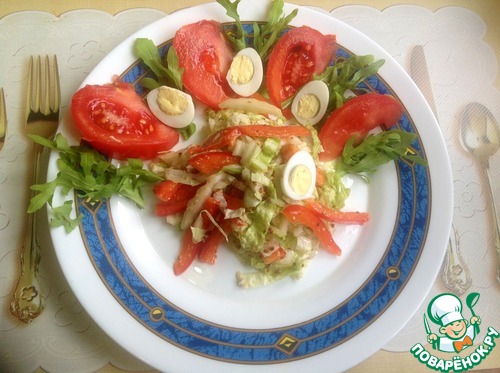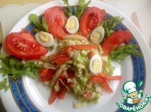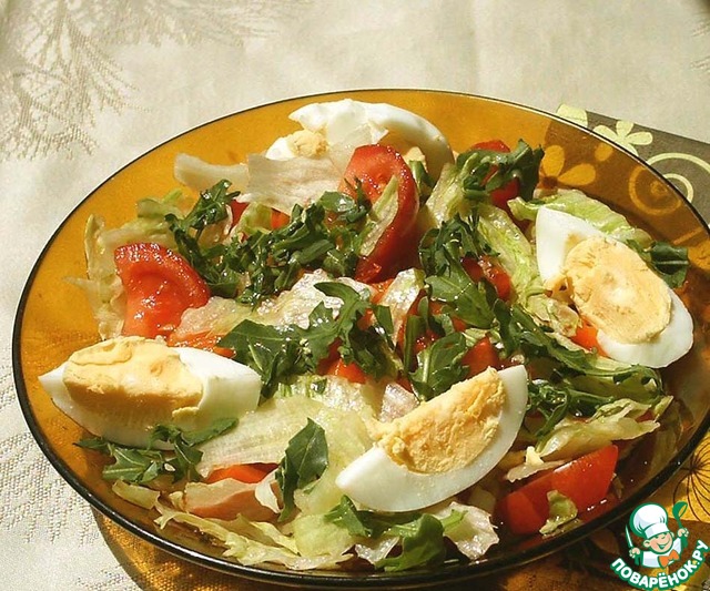 Помидоры порезать дольками, яйца очистить и разрезать пополам. Салат подавать порционно, украсив рукколой.