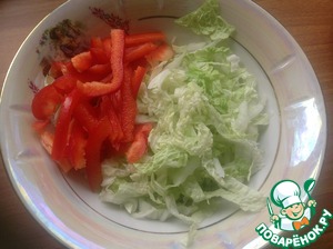Капусту нашинковать, добавить к ней перец, порезанный соломкой.