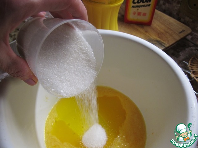 К соку добавить растительное масло и сахар. Хорошо перемешать, чтобы сахар разошелся.