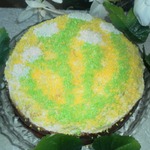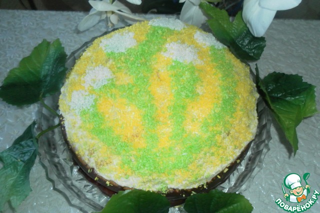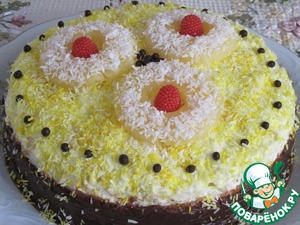 Присыпим крем желтой кокосовой стружкой. Положим колечки ананаса, присыпим его белой стружкой. По желанию украсим конфетками. Обмажем шоколадной глазурью бискитный корж.