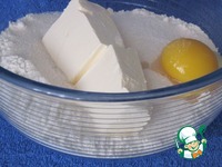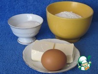 Приготовить продукты для песочного коржа. Для теста используется только желток, мука, сахар, маргарин.