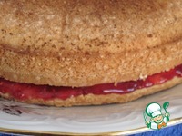 Остуженный песочный корж смажем малиновым джемом. Малиновый джем очень ароматный.
