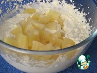 Порежем кольца ананаса на кусочки, добавим в крем. Желатин подогреем до состояния, когда он растворится и добавим в крем, не забудим 3 колечка ананаса оставить для украшения.