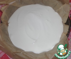 • Приготовим безе: взбить белки с сахарной пудрой до густого состояния. Форму застелить бумагой для выпечки и вылить в нее полученную массу. Оставить часть массы для того, чтобы сделать капельки-безе для украшения.