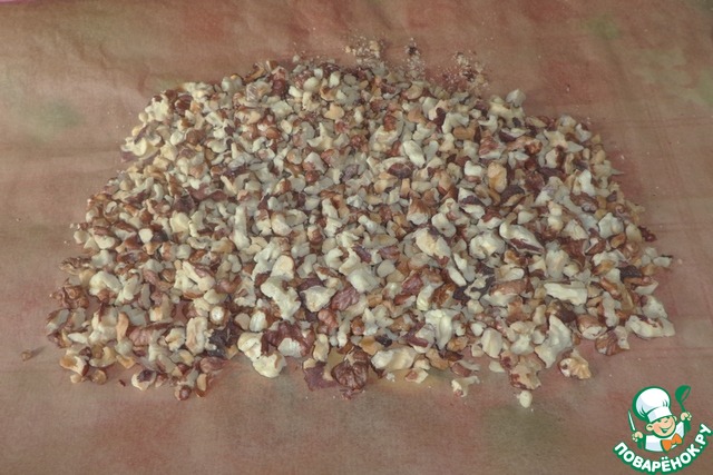 • Грецкие орехи выкладываем на противень и ставим в духовку на несколько минут. Данная процедура придаст орешкам приятный вкус.