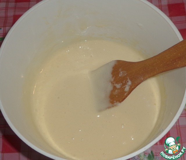 Приготовим бисквитное тесто для 3-х коржей: желтки отделить от белков. Желтки взбить с сахаром, добавить муку. Охлажденные белки взбить до густой пены и добавить в тесто. Всё хорошо перемешать до однородности.