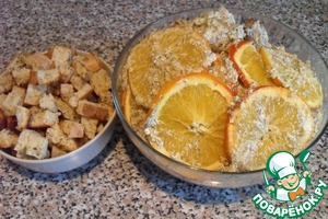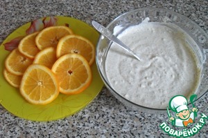 • Выкладываем в форму курицу, сверху заливаем сметанным соусом (перемешивать необязательно) и закладываем апельсинами.