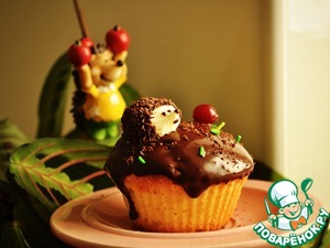 Теперь очередь ежиков. Взять нашу заготовочку из белого шоколада за «носик» и окунуть в ганаш до «мордочки». Посыпать облитую часть натертым шоколадом. Торжественно усадить ежа на кекс. Зубочистку обмакнуть в ганаш и нарисовать носик, глазки и ротик. Дальше я «посадила» немножко травки из сахарной посыпки, здесь есть, где развернуться фантазии.