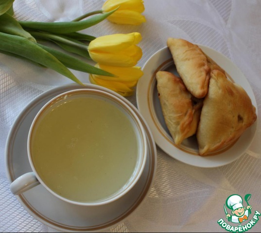 ну и конечно же бульон! это также ключевой момент! я к эчпочмакам приготовила куриный бульон, и когда они были почти готовы влила в каждый по 2 столовых ложечки и по кусочку сливочного масла! не поленитесь, купите хотя бы суповой набор и приготовьте бульон, он придаст начинке невероятную сочность!
