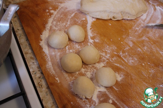 Разделить на несколько крупных частей. Взять одну из них и разбить на мелкие круглые булочки по 100 г.