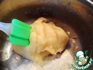 Делаем заварное тесто. Воду, сахар и масло довести до кипения, всыпать муку и постоянно помешивая, проварить 2 минуты на маленьком огне.