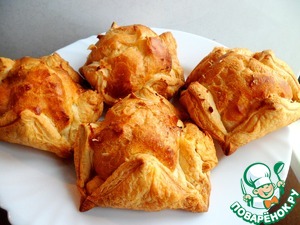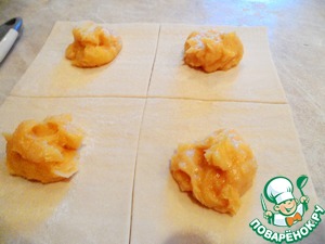 Раскатать слоеное тесто и нарезать на 10 квадратов со стороной 12 см. На каждый квадрат выложить по 1ст. л. заварного теста.