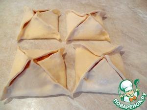 Загнуть уголки квадратов к середине. Уголки квадратов чуть прищипнуть, чтобы они сильно не раскрылись при запекании. Верх не прищипывать, т. к. там будет вверх подниматься заварное тесто. Положить на смазанный маслом противень и запекать 25-30мин. при температуре 200 градусов.