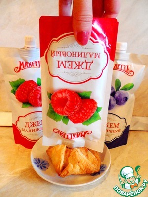 Каждое пирожное начинить любимым джемом ТМ "Махеевъ", у меня малиновый и черничный. Тонкое горлышко упаковки аккуратно входит в пирожное и начиняет его джемом не хуже кулинарного шприца!