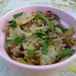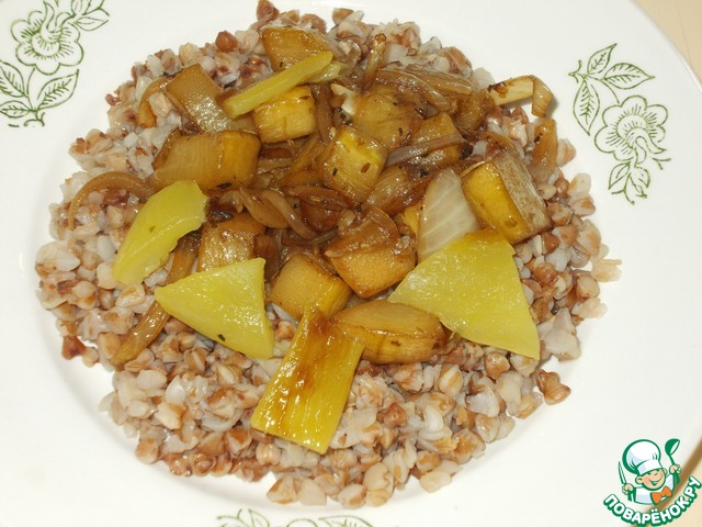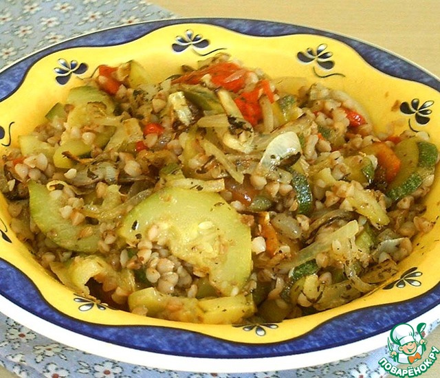 Обжариваем на сковороде кабачки с луком. В идеале это лучше сделать на сковороде-гриль, но я делаю на обычной. Обжаренные овощи отправляем к гречке.