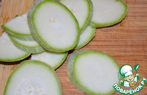 Кабачки моем и режем по диагонали на тонкие ломтики.