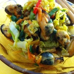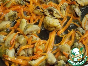 Масло разогреть на сковороде и обжарить морковь, нарезанную мелкой соломкой,3 мин. Добавить размороженные и ошпаренные мидии (отжать жидкость). Перемешать и жарить 2 мин.