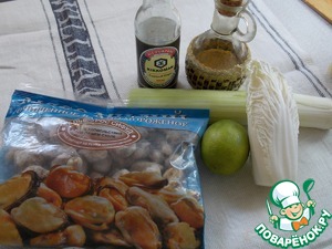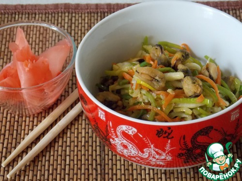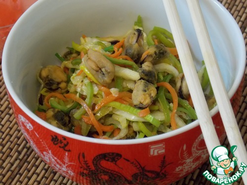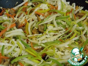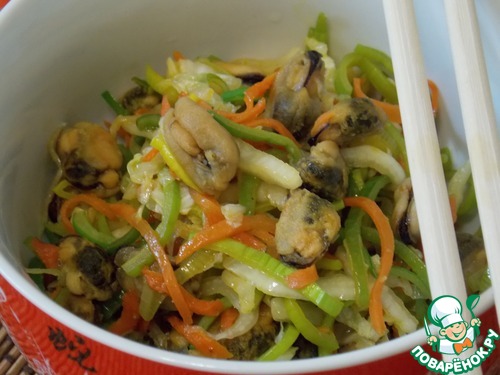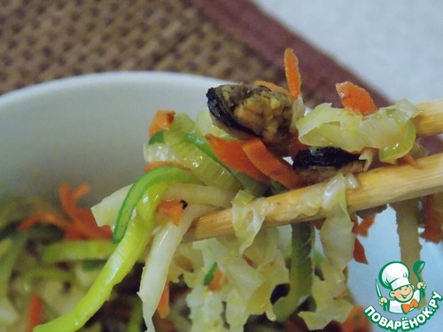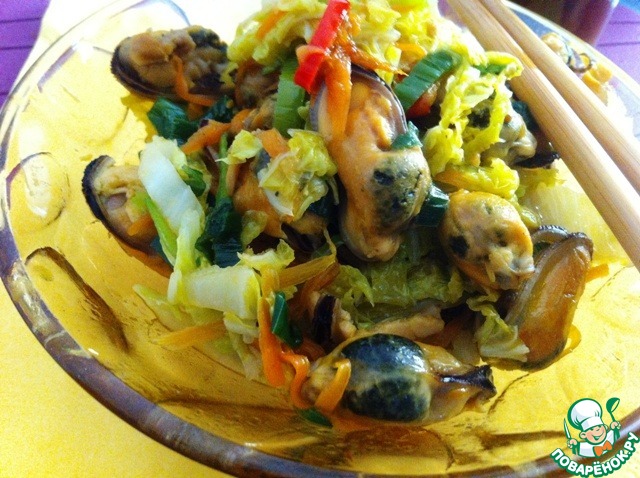 В мидии добавить соевый соус, положить лук и капусту. Готовить еще 2 мин. -