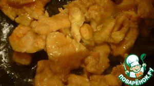 Этим временем смешиваем соевый соус и коричневый сахар, оставшийся кусочек рыбы режем на маленькие кусочки и заливаем получившимся маринадом. Оставляем на 20 минут.