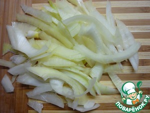 Лук нарезать полукольцами и обжарить на оливковом масле.