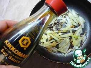 Добавить соевый соус и тушить, пока не испарится жидкость. Лук должен чуть хрустеть.