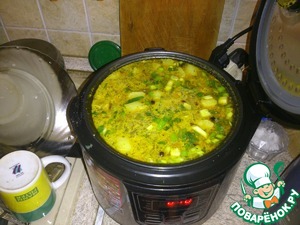 Минут за 15 до окончания программы всыпаем зелень, лавруху и душистый перец.