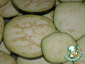 Толстенькие баклажаны порезать кружочками не толще, чем 0,5 см. Посолить и дать чуток отлежаться.