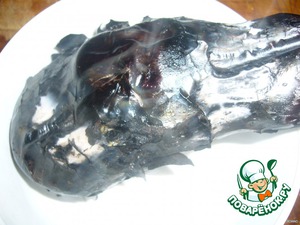 Средний баклажанчик запечь на открытой конфорке до чёрной шелушащейся корочки.