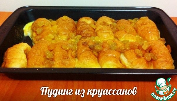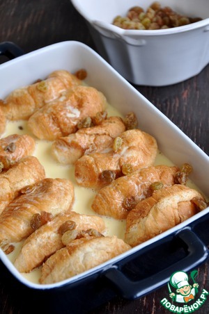 Когда круассаны напитаются сливочно-ванильным соусом и перестанут всплывать, высыпать оставшийся изюм.