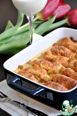 Залить сливочной массой. Оставить минут на 15. Время от времени круассаны следует придавливать в сливочный соус, чтобы они лучше напитались сливочно-ванильной смесью. Посыпать частью изюма.