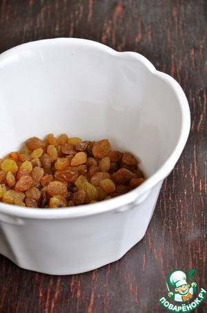 Изюм хорошо помыть, залить горячей водой для набухания.