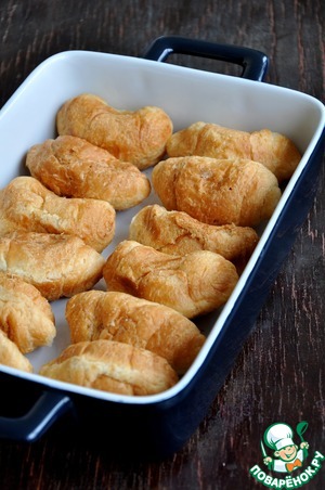 Выстелить круассанами форму для запекания, предварительно смазав ее сливочным маслом.