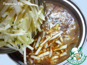 Когда картофель уже сварится, вместе с зажаркой, кладем капусту в будущий борщ.